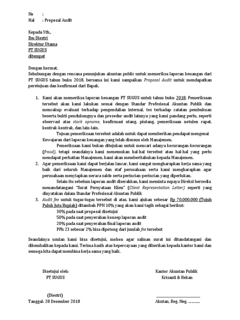 Hello selamat menonton ^^ berikut pemaparan materi pratikum audit modul 9 yaitu penyelesaian audit pt sugusmohon maaf jika ada kesalahan sengaja maupun tidak. Tennessee also uses grant awards to achieve many of its objectives and programmatic responsibilities. Selisih ini berasal dari pendapatan investasi dan dividen dari pt piglet. Proposal audit kepada yth., ibu diestri direktur utama pt sugus di tempat dengan hormat, sehubungan dengan rencana penunjukan akuntan publik untuk memeriksa laporan keuangan dari pt sugus tahun buku 2018, bersama ini kami sampaikan proposal audit untuk mendapatkan persetujuan dan konfirmasi dari ibu. Please provide four (4) paper copies and one (1) digital copy of your proposal.