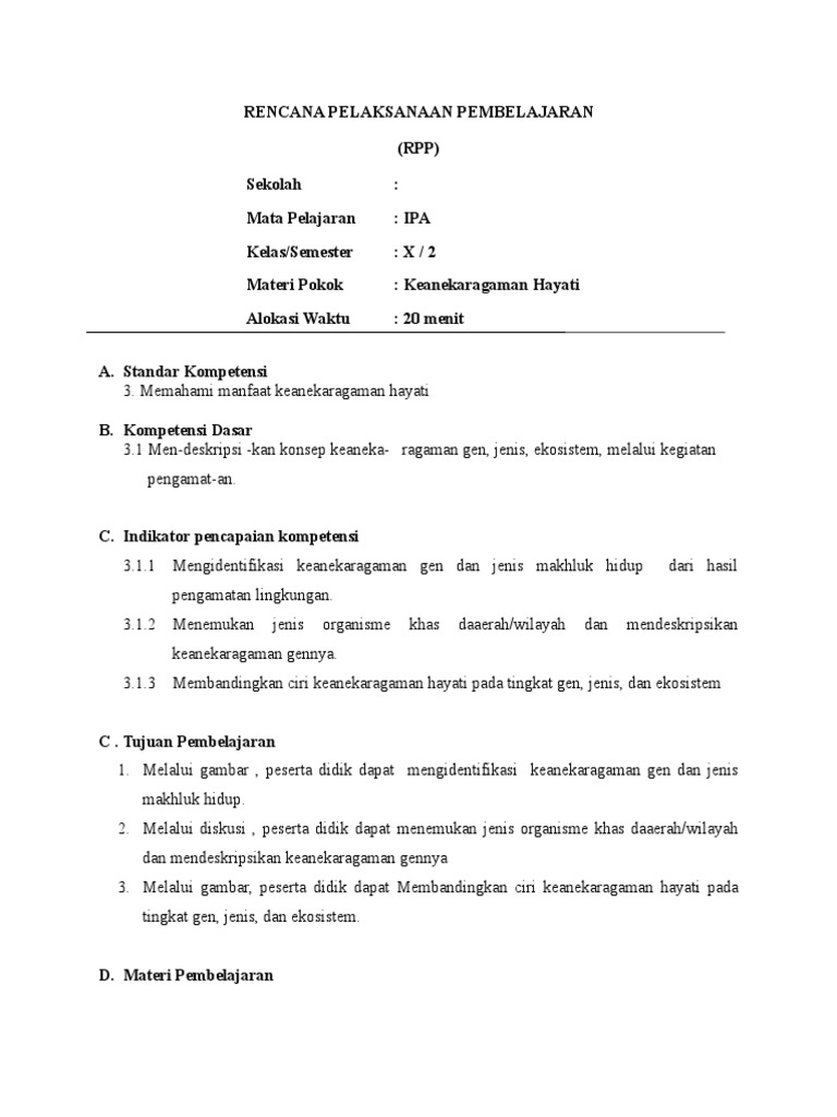 Contoh rpp biologi sma terbaru kelas 11 ini kami sediakan dalam format doc / ms word. Rpp biologi kelas x sma materi keanekaragaman hayati kurikulum 2013 edisi revisi. Keanekaragaman hayati (1) kurikulum 13 (2) kurikulum 2013 (4) pengolahan nilai sikap. 1213041073 jurusan pendidikan biologi fakultas matematika dan ilmu pengetahuan alam universitas pendidikan ganesha 2014 rencana pelaksanaan pembelajaran (rpp) a. Berikut ini adalah contoh kurikulum 2013 smp bahasa indonesia pdf yang bisa digunakan untuk melengkapi administarsi guru yang dapat di unduh secara gratis dengan menekan tombol download.